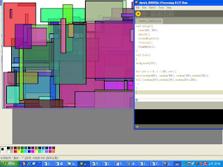 In the fist exercise, I've learned how to use loop function to generate 100 rectangles with random colors, positions, and sizes. In the beginning, I thought that it must be a tough task to command each rectangle with random conditions. Afterward I finally figured out how to collocate random() function with rect() and fill() functions which we have known from last week lecture. I found that random() function is really useful while creating any graphs in random way.